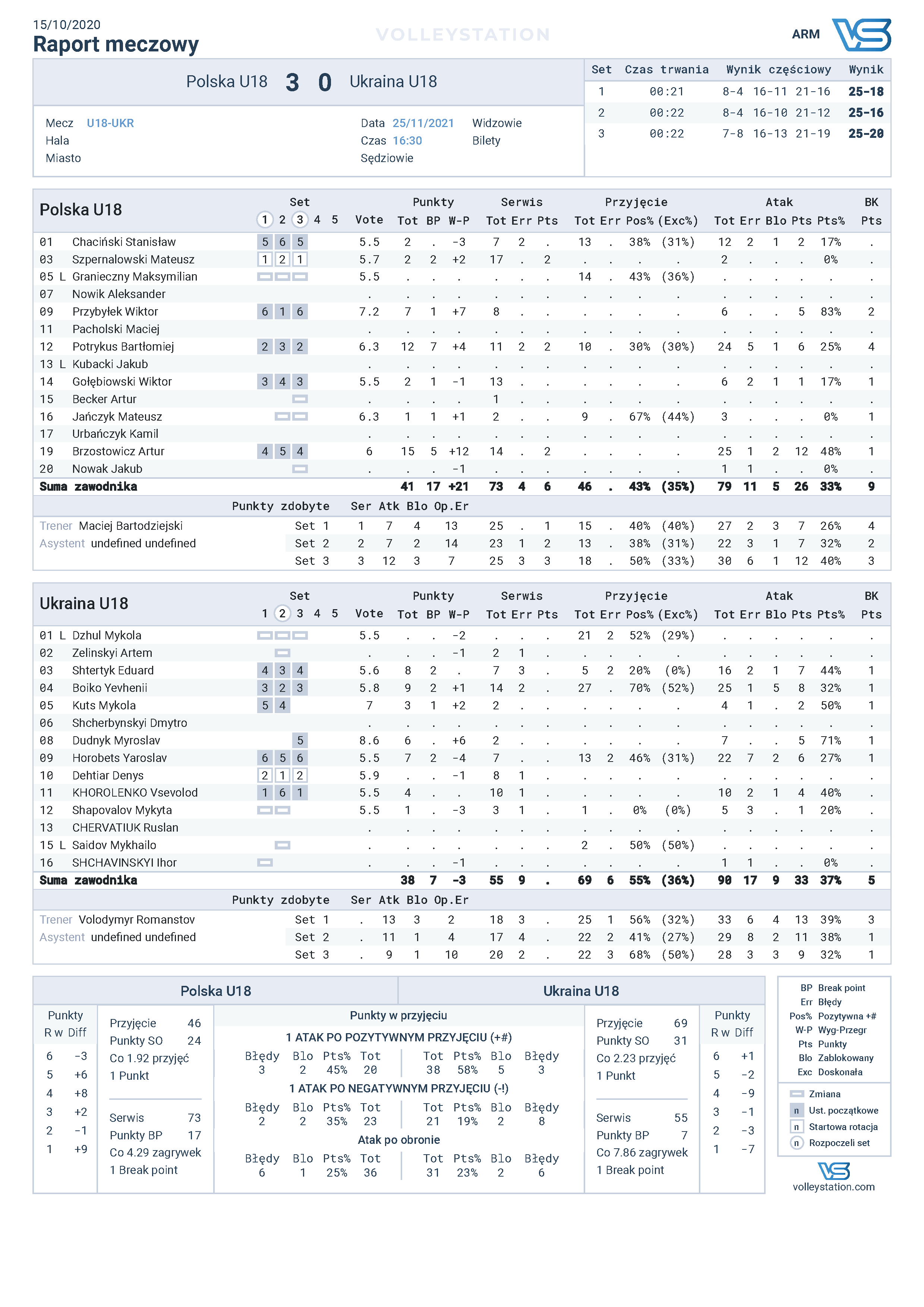 Po bardzo wyrównanej pierwszej połowie seta nr 3 Biało-Czerwonym udało się szybko zbudować kilkupunktową przewagę. Ukraina prawie doprowadziła do wyrównania (19:18), ale na tym zagrożenie się skończyło. Dwie punktowe (22:19, 23:19) zagrywki Bartka Potrykusa właściwie przypieczętowały zwycięstwo Polaków, a kropkę nad i mocnym atakiem postawił Artur Brzostowicz.