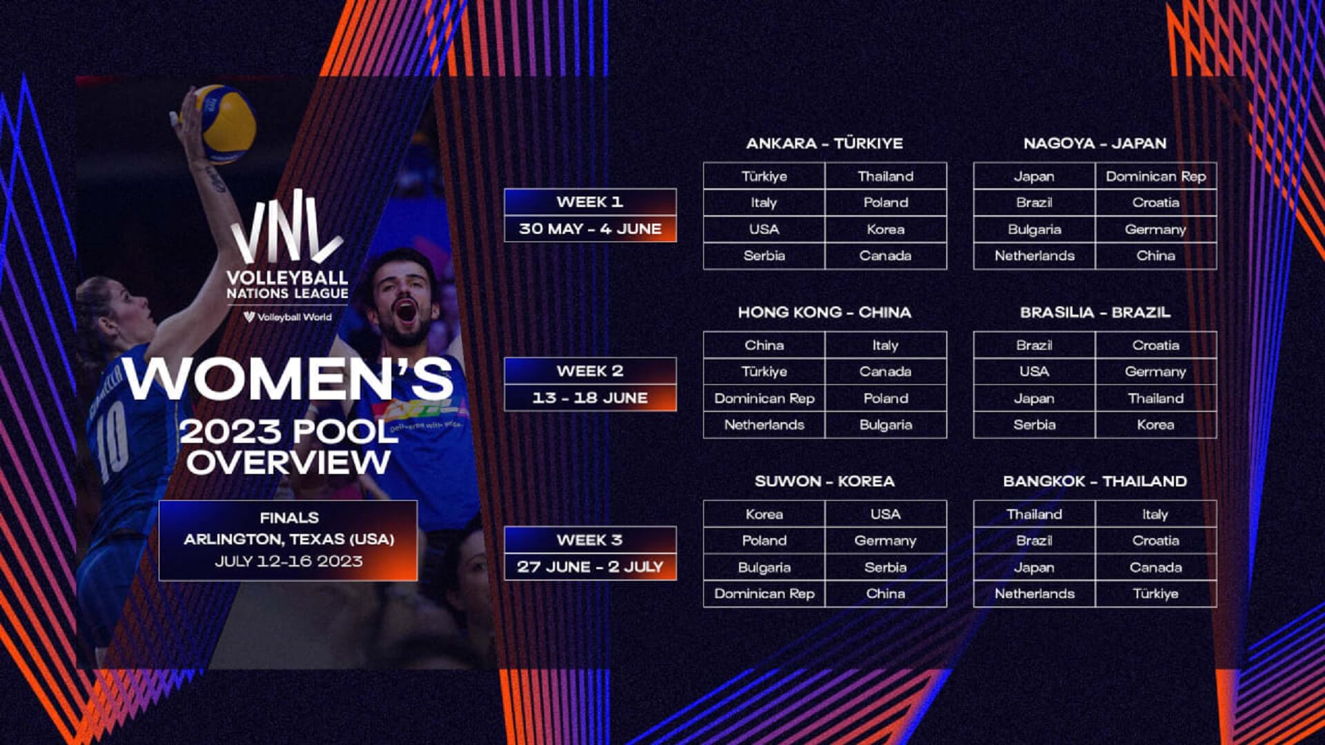 Ogłoszony został także gospodarz finału VNL siatkarek. Osiem najlepszych drużyn przyszłorocznej Siatkarskiej Ligi Narodów Kobiet zmierzy się 12-16 lipca w Arlington (Texas) w USA.