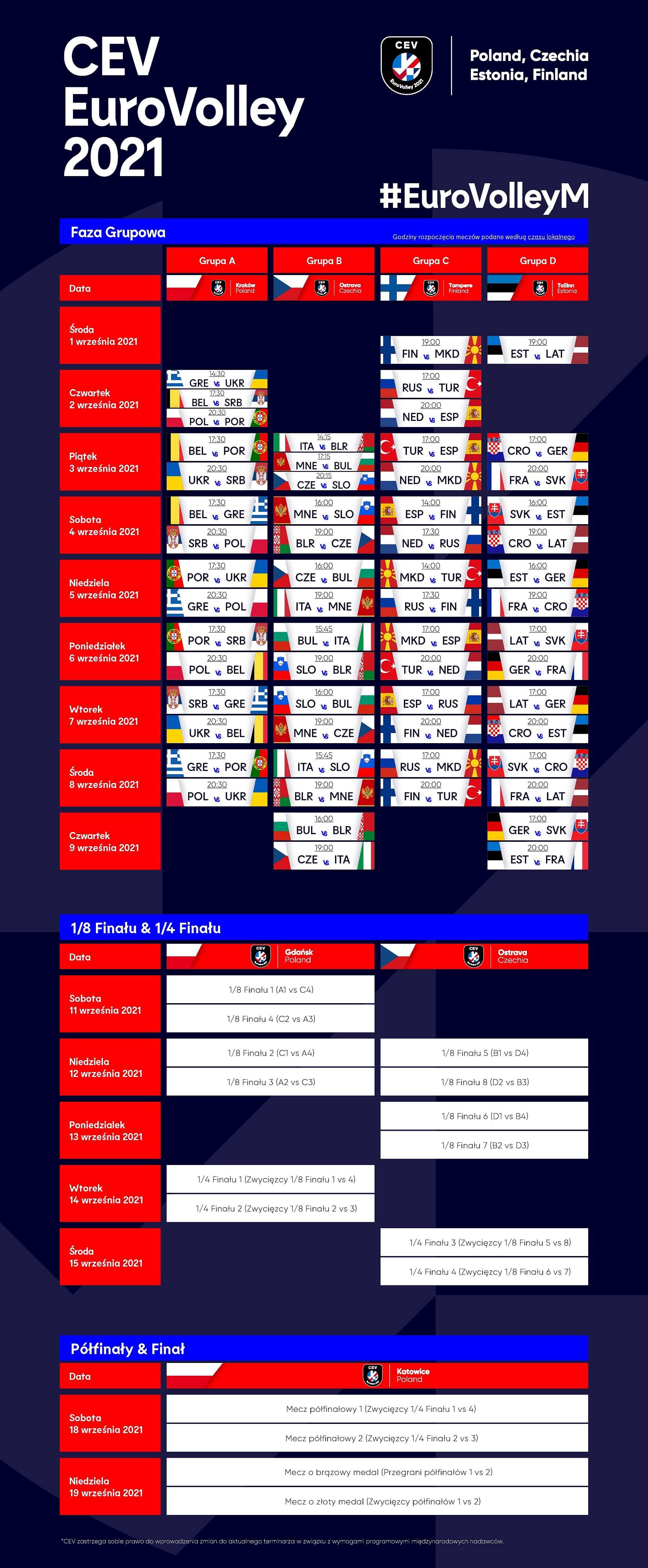 1 września 2021 r. dwanaście najlepszych europejskich reprezentacji zakwalifikowanych do długo wyczekiwanego CEV EuroVolley Mężczyzn 2021 rozpocznie rywalizację o najważniejsze trofeum Starego Kontynentu. Po szczegółowych dyskusjach ze swoimi partnerami i wszystkimi zainteresowanymi stronami Europejska Konfederacja Piłki Siatkowej ogłosiła harmonogram meczów dla fazy grupowej turnieju.